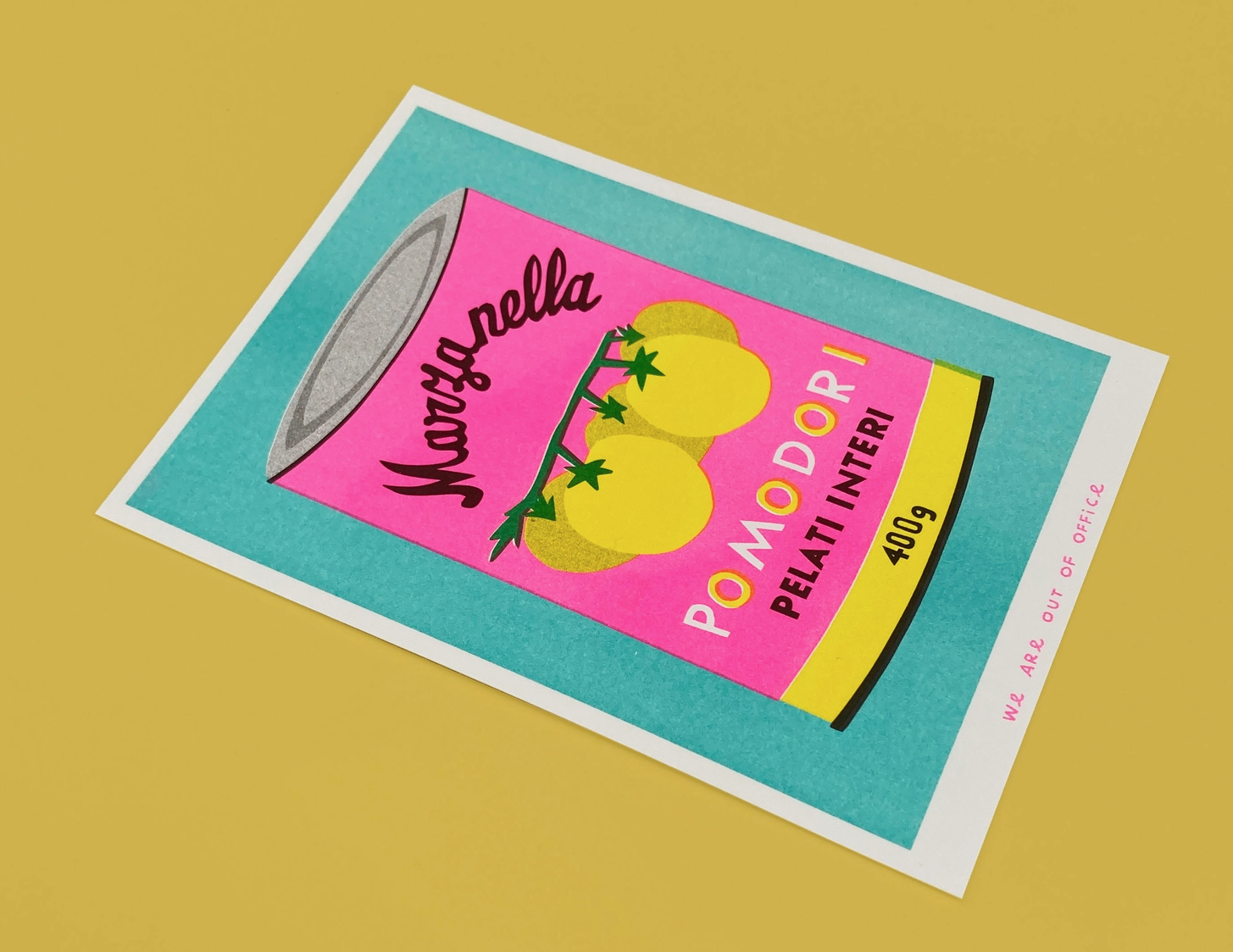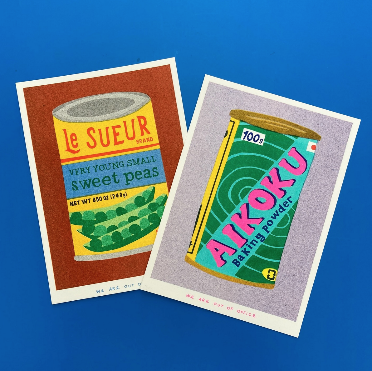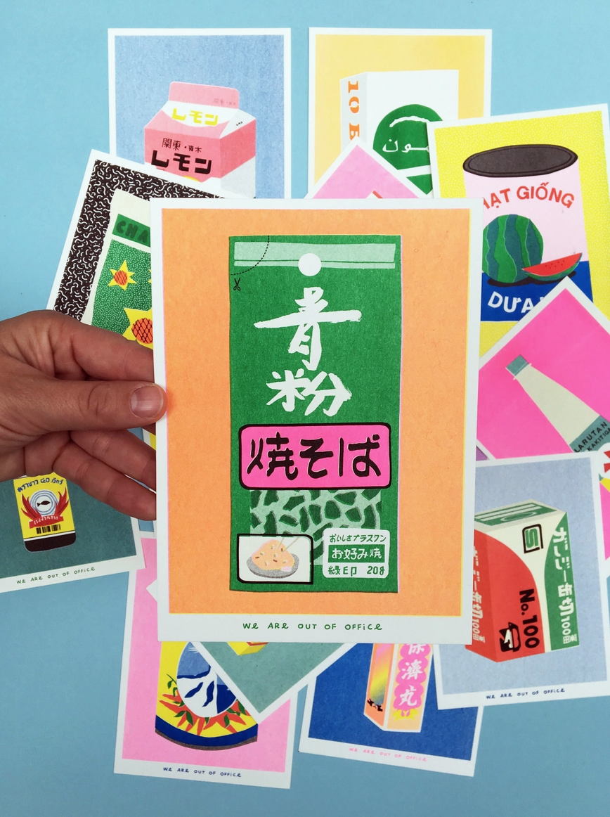 (EN:) Winneke de Groot and Felix van Dam are two artists working together under the name: ‘We are out of office’. They’re very DIY in their approach to art, skilled as screen printers, painters and illustrators. They run a small studio including a screen print and risograph workshop based in a cherry orchard just outside Utrecht. Their work is inspired by little rarities and memories they pick up in daily life. They use a wide range of media covering print, paiting, sculpture, textile and more. Their style is recognisable and has a bold and colourful aesthetic and reflects their graphic background.