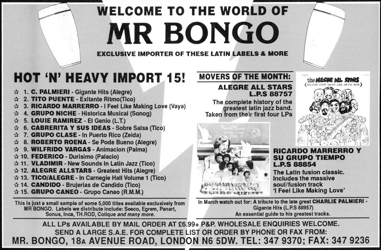 Mr. Bongo begann sein Leben 1989 als kleiner Plattenladen unter Daddy Kool's Reggae Store in der Berwick Street in London. Sie waren der erste Laden, der Vinyl-Veröffentlichungen von unabhängigen Hip-Hop-Labels wie Def Jam, Rawkus, Nervous und Big Beat außerhalb der USA verkaufte. Mr Bongo wurde auch ein etablierter Anbieter für schwer zu findende, klassische lateinamerikanische Musik, insbesondere brasilianische, außerhalb Amerikas.