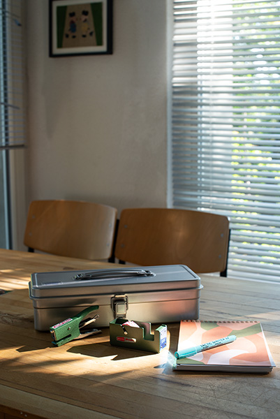 Practical and beautiful items for the desk. For example, the metal toolboxes from Japan. Manufactured since 1969 from a single sheet of metal. You can store all sorts of things in them and your desk will look neat and tidy again. Karst notebooks are made of stone and are therefore waterproof, but above all the soft, cool paper is wonderful to write on. Things for people who spend a lot of time at their desk.